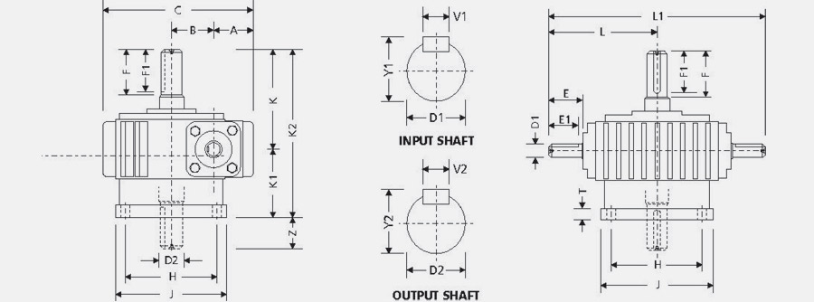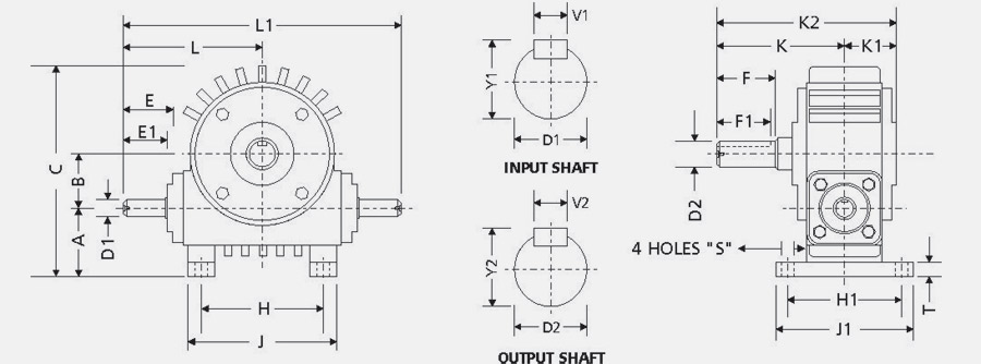 | Size | A | B | C | D1 | E | E1 | D2 | F | F1 | H | H1 | J | J1 | L | L1 | K | K1 | K2 | T | V1 | Y1 | V2 | Y2 | S | Wt. (kg) | Grs. Qty. |