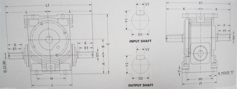 | Size | A | B | C | D1 | E | E1 | D2 | F | F1 | H | H1 | J | J1 | L | L1 | K | K1 | K2 | J2 | Z | T | T1 | V1 | Y1 | V2 | Y2 | S | Wt. (kg) | Oil Cap. |